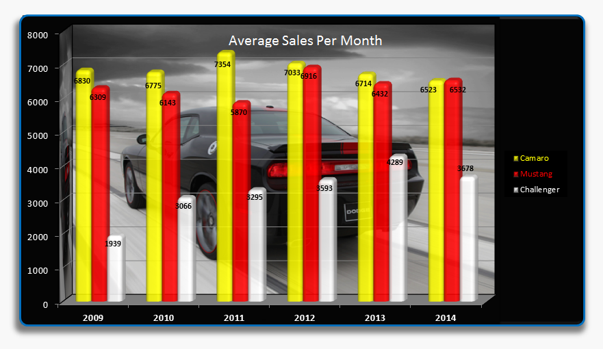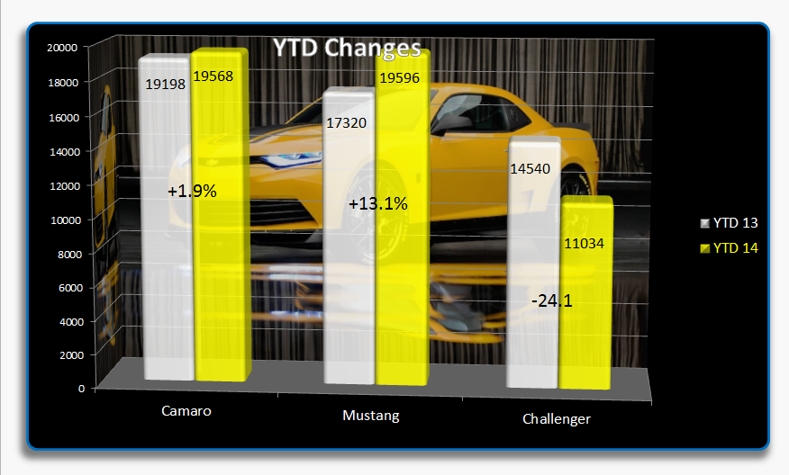 Camaro March 2014 Deliveries (actual sales): 8,624 6% (Pr Ye) Compared to Competition: Mustang March 2014 Delivery (sales):9,305 21% (Pr Ye) Challenger March 2014 Delivery (sales):4,882 -20% (Pr Ye) |