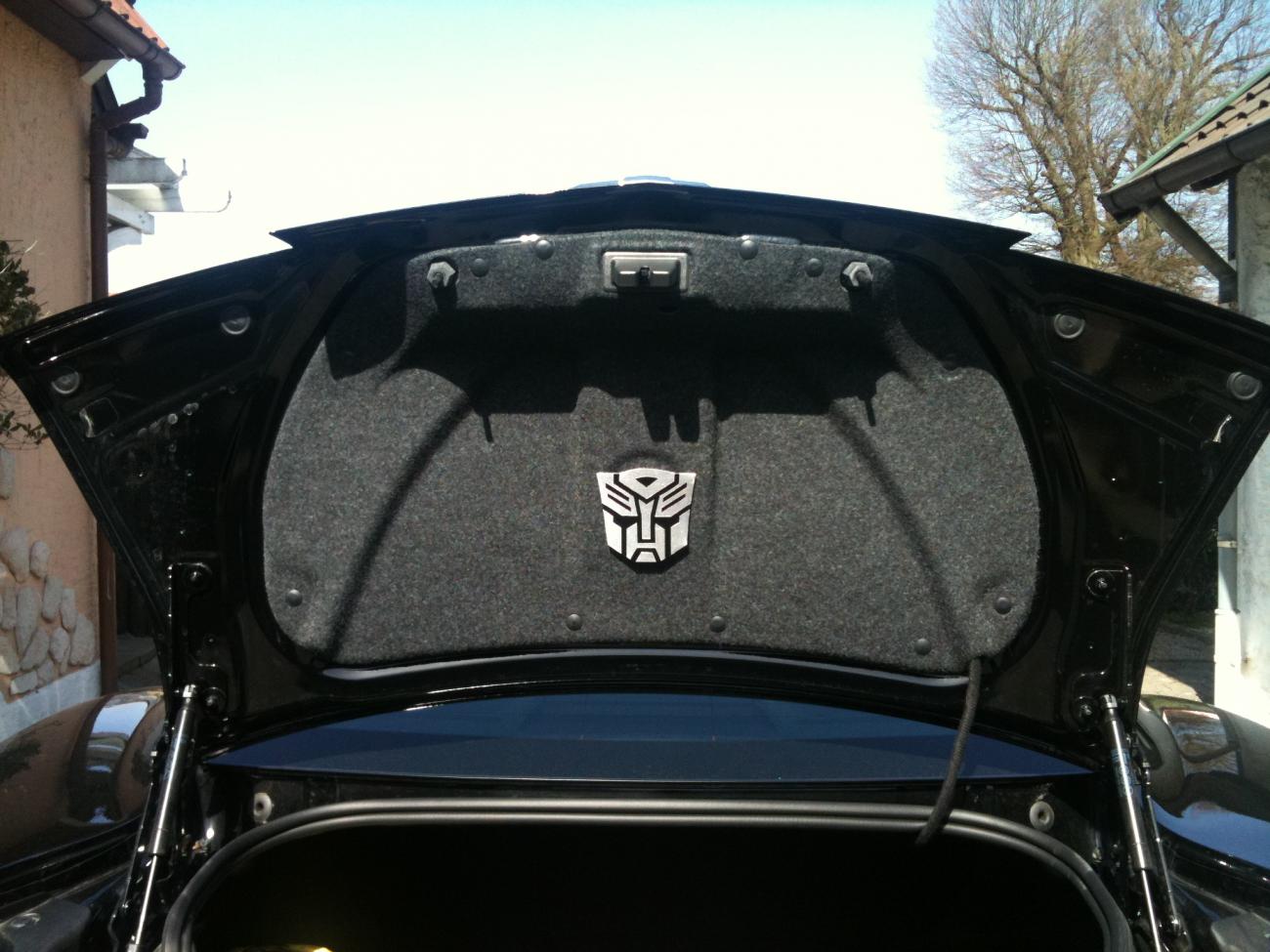 ![]() I took some Aluminium panels, cut the edges to the Autobot shape and powder coated the black lines at work by myself. I placed it into the trunk lid on the safety sign. ![]() And this is how it looks like. |