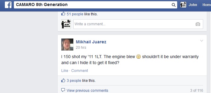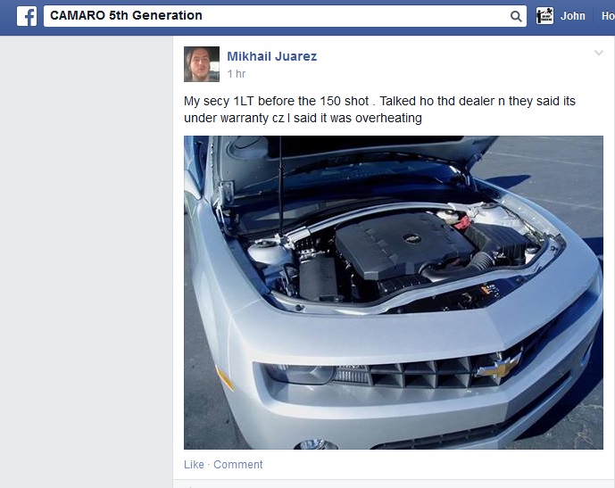 Some guy is posting stuff on Facebook to a group called Camaro 5th Generation about how he messed up his V6 with nitrous and now wants GM to replace his engine under warranty. He has removed the nitrous set up and told the service writer at the dealership that it was overheating.
