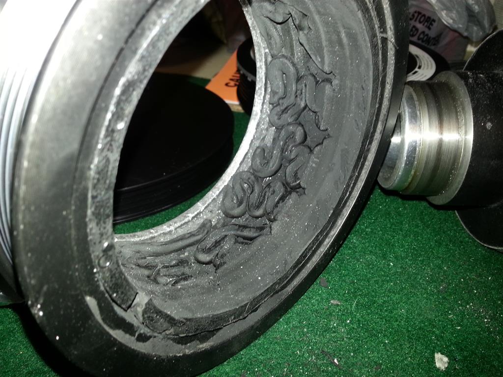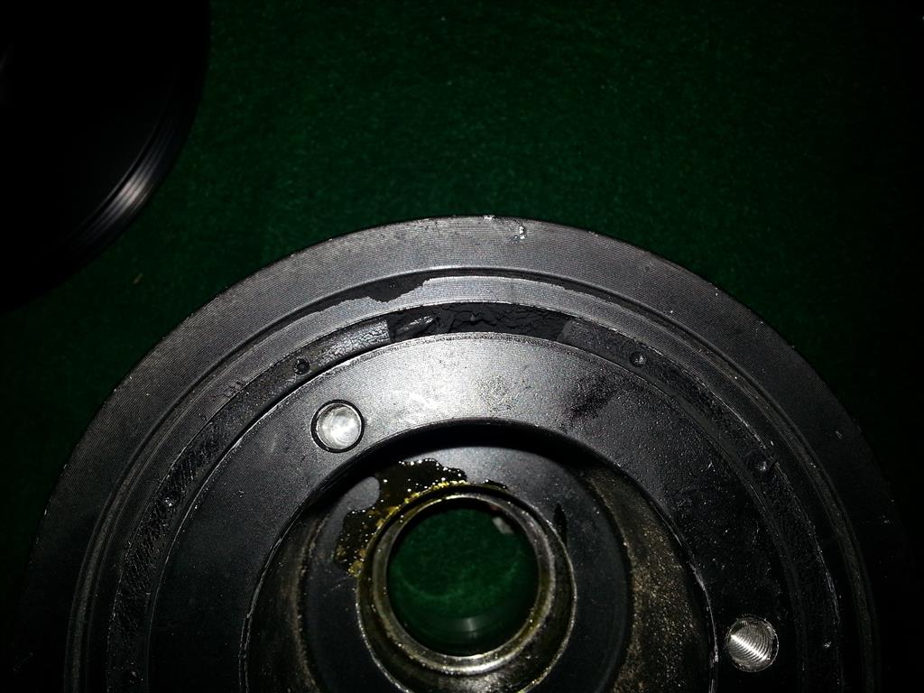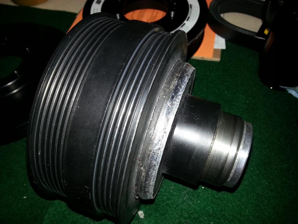 yep, it uses what appears to be vulcanized rubber to hold the 'belt' pulley on. It's separated and wobbles now -- thus causing both belts to slip. I can grab that part of the pulley and its wobbles by hand. I may have been that '1' where you get a bad one, but Ryan has seen this on another one. SLP has had these for a while and I'm not seeing too many complain.