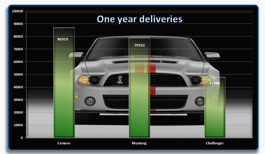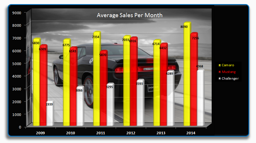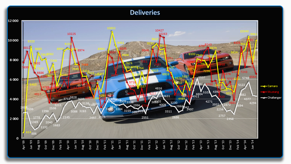 Camaro July 2014 Deliveries (actual sales): 9,961 25% (Pr Ye) Compared to Competition: Mustang July 2014 Delivery (sales):6,564 14% (Pr Ye) Challenger July 2014 Delivery (sales):4,294 1% (Pr Ye) |