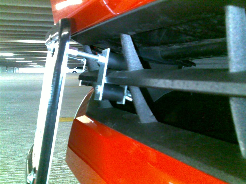 I made 2 brackets that mount to the center cross-bar of the lower grille. I used four 2" mending plates with longer 3" bolts through the top holes and shorter 2" bolts through the bottom holes of the plates. I put a 1" plastic spacer on the bolts between the plates to kind of center the brackets on the cross-bar. On the longer bolts, I put a 3/4" coupling nut on the end and then used 1/2" bolts to screw through the plate into the coupling nuts to hold the plate on. The top bolts are inserted from the back and face outward. The lower bolts are inserted from the front and face towards the radiator. The lower bolts are held in place with a wing nut so I can remove those and take the entire bracket off when I want to. I still need to adjust it a bit because it is still a bit more angled than I want and sits a bit too far away from the lower lip of the fascia for my tastes. After about 1000 miles, it seems to be holding up well without doing any damage to the grille or fascia.
