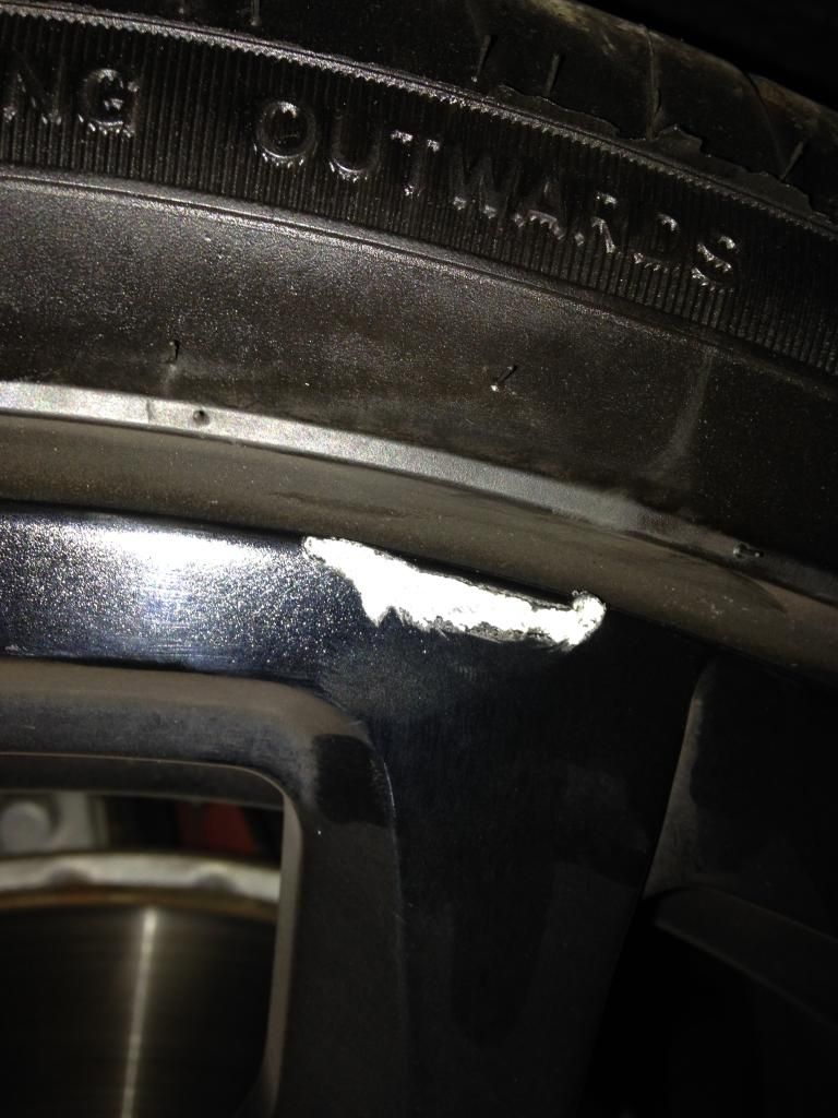 My guess is that they drove it onto a lift or a rack that was too narrow or something. You can see in the first picture, there's actually a slice in the edge guard on the tire. I'm certain that had to come from something metal, definitely not a curb or anything.