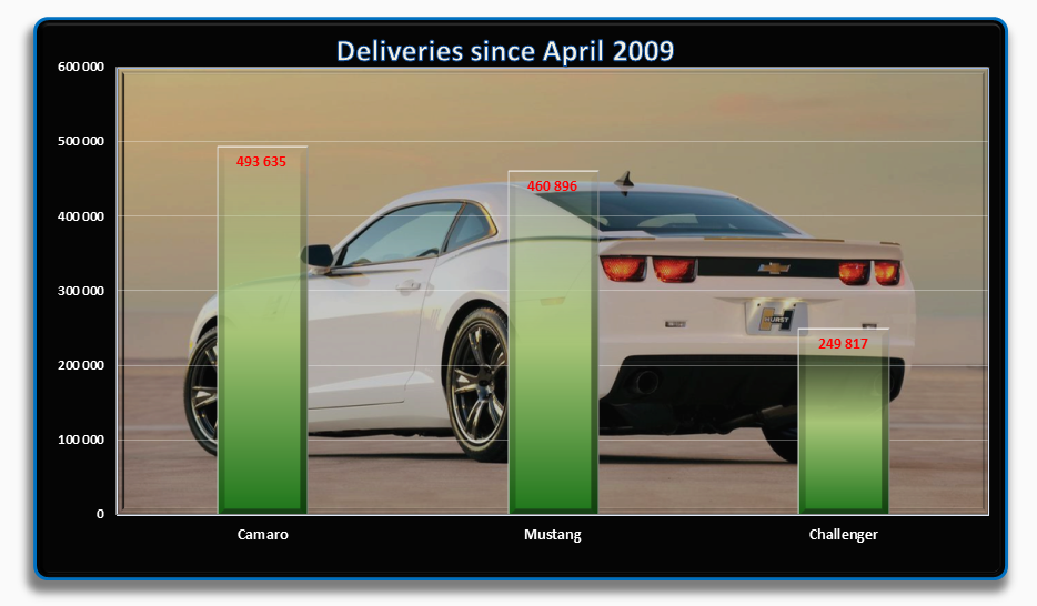 Camaro February 2015 Deliveries (actual sales): 6,373 3% (Pr Ye) Compared to Competition: Mustang February 2015 Delivery (sales):8,454 32% (Pr Ye) Challenger February 2015 Delivery (sales):5,255 42% (Pr Ye) |