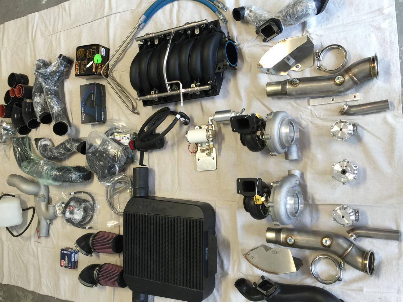 AGP turbo kit with BB Garrett turbos, good for 1000whp, auto cooler lines, powder coated piping, plugs, blow off valves, etc