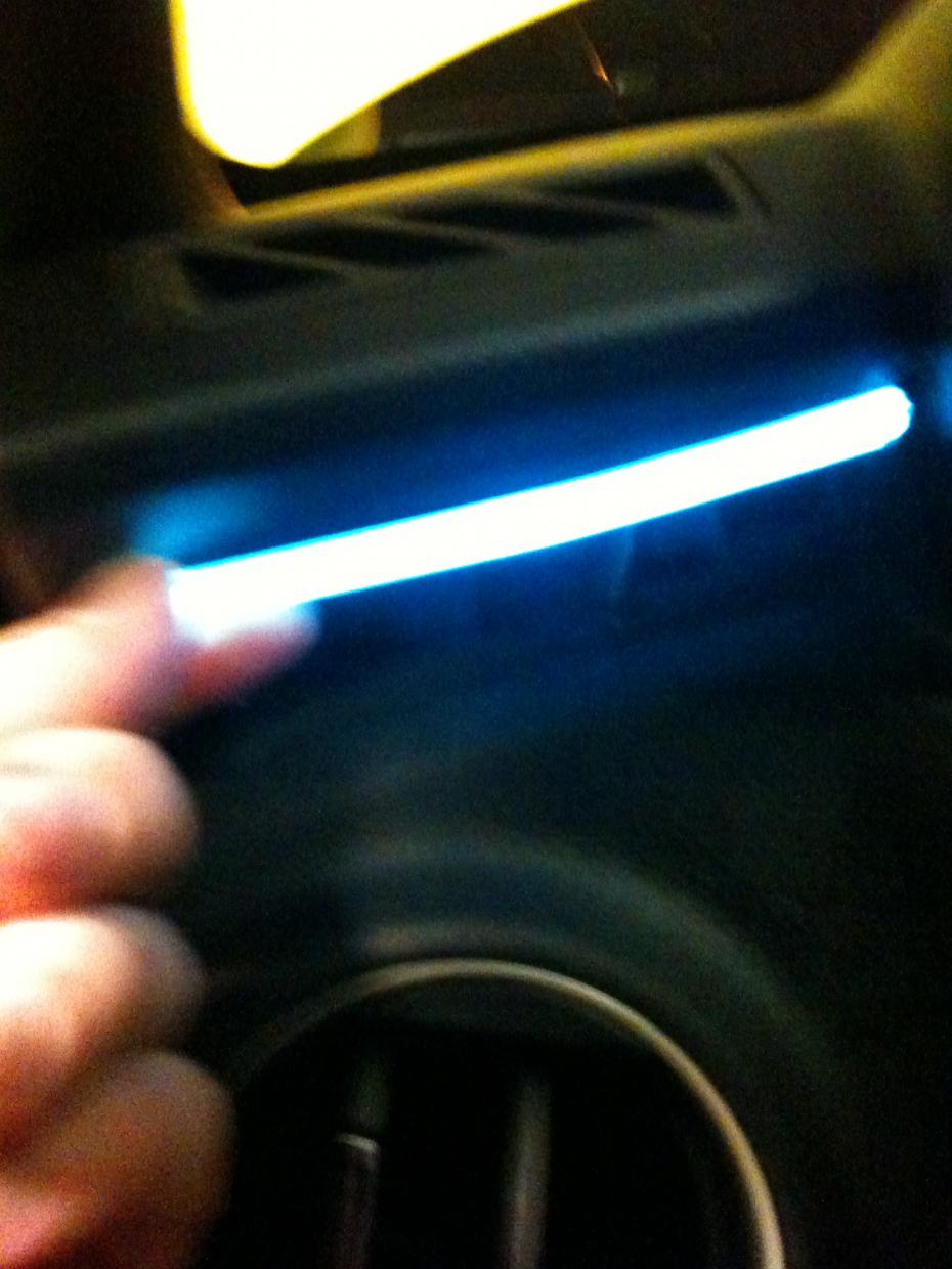 2SSRS and I have been chatting picking each others brain for the last 2 weeks about this mod and many others. That's what makes this fun though!!! First you need to get the light tube from digi-key. part #A99861-ND You also need 2 door connector abl connector/lights gm part #92228416 (red) I am still waiting for my other red light bulbs to come in so I used the blue for a demo. Then you cut both pieces to match the length of the plastic inserts plus +1/2 inch. That will allow you to hook up the light connector to the light tube via the guage cluster. Nice job 2SSRS! Then you will have to cut /drill a hole in the corner of the dash behind the plastic. This will allow you to slip the tube behind the plastic pieces on the dash.[ I also notched out the dash piece. AS seen in the picture. I used a razor blade witch lets you make a slit. I think it'sa better way to go so you can adjust the light beam. ATTACH]51312[/ATTACH]