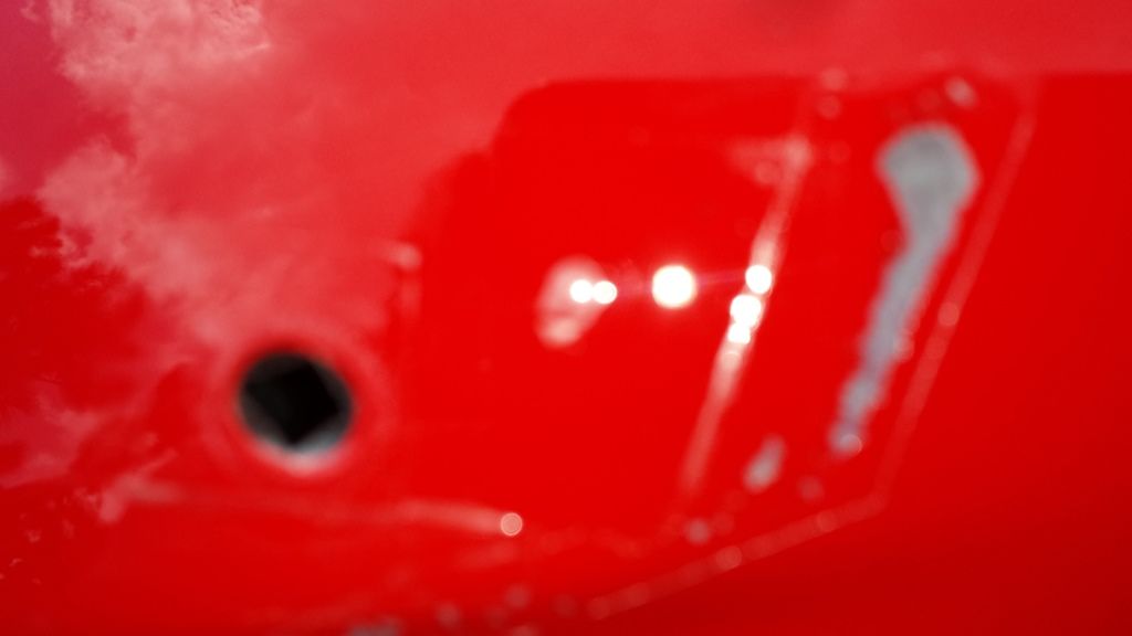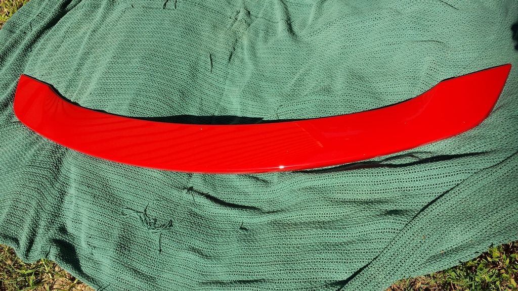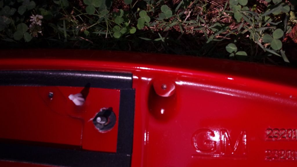 Removed 2014 SS Spoiler ![]() Flipped Spoiler Over ![]() And here is the Label with Color Name: Pull Me Over Red ![]() Went out to Snopes.com to see if there is any truth to Red cars be pulled over for speeding more often and found the following ... Snopes: "Gray cars were the ones that gained a greater share of the speeding tickets than they statistically should have: while they accounted for only 6 percent of cars on the road, they pulled down 10 percent of the tickets issued." The photo below shows the trunk lid wear spot on right side of pic (at 4,000 miles), near where the spoiler rubber mount pad touches the trunk lid. I clear coated over the bare aluminum. Then put Xpel film around mounting holes, and put thin 3M mounting tape under the triangle cushions to increase clearance slightly at the mount points. Fuzzy image is caused by camera picking up the cloud reflection -focusing thrown off on camera phone. Some of the clear Xpel film shows up at margin of the mounting hole in photo below. For others that are going to remove the SS 2014/2015 spoiler for maintenance: there are 6 rubber plugs on the underside of the trunk lid - remove those for access to the six nuts (have built-in washers). Then pull EXACTLY straight up on the spoiler to release the white nylon centering pin from the black plastic centering grommet (white nylon pin shown in pic 2 above, to the left of the middle bolt stud). It will all of a sudden pop loose. Best to be careful on this step to prevent scratching the mounting holes or paint on the trunk lid deck. Ron