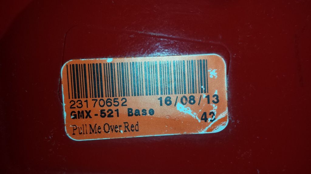 While removing the spoiler from the trunk to fix the hidden wear spot under the SS factory spoiler, noticed label on the car that shows car color is "PULL ME OVER RED" --- official published car color is "RED HOT".