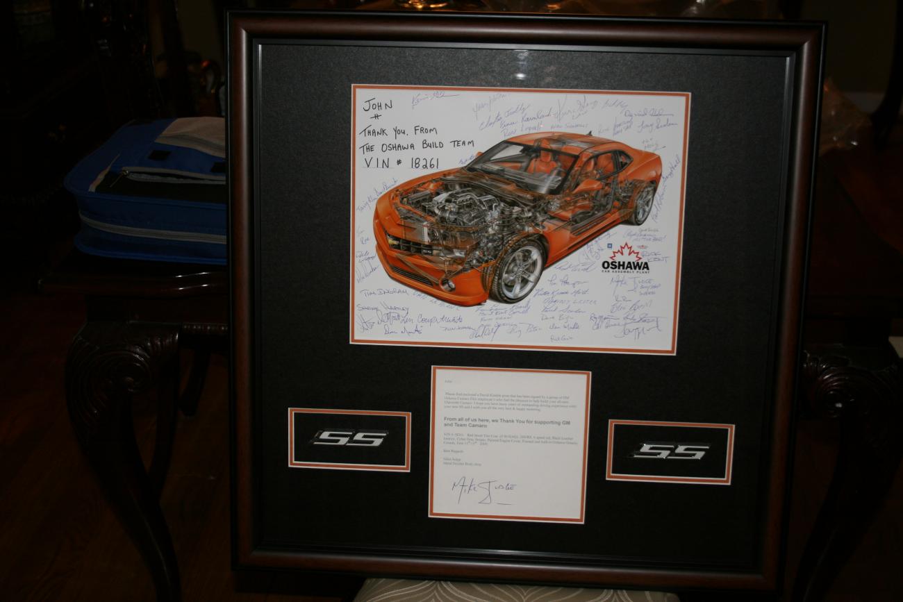 Thanks for making my Camaro dream come true. 2010 Camaro SS, RJT, Black Leather, 6 Speed Manual, Polished Wheels and Engine Cover. 2G1FT1EW7A9118261 Hello Everyone, About 4 ½ to 5 years ago I saw a rendering, in a car magazine, of the coolest thing I had ever saw. It was a drawing of a Camaro, with the title “Look out Mustang”. I made several calls to General Motors asking about the car and was given the normal statement that this was just a “Concept”. I was so enamored with the drawing that I started saving money not really knowing if it would ever become a reality. In 2006 we all know that the “Concept” was built and displayed at the Auto Show, once again I called General Motors to inquire about this car as I am sure many of the enthusiast did, the lady told me that they had received over 700,000 calls on the Concept Camaro, so I signed up for updates like many others. Fast forward a few years and the dream became a reality, General Motors to produce the Camaro. Now I am really excited, and of course started dreaming of my new car, then came all the questions that happen, What color?, What options do I want, you know, the normal guy thing. So in October 2008 I ordered my dream car, one that I have been saving for 4 years and waited. You see I am just an ordinary guy from Alabama, simple guy really. I have been fortunate to own a General Motors vehicle since I was old enough to buy one. I am the kind of person who tries to think about others before myself. Well this one time I decided that this was the car for me. So like all others that placed an order I have waited what seems like an eternity but in reality just a few short months for my dream car. At the end of May I received a call from my dealer stating that they had received their closure letter and that they would be closing and would not be receiving any allocations for anything and that I would not be getting my Camaro as ordered because it had been canceled. I was stunned, and in shock, to say the least. I wrote a letter to Mr. Frederick Henderson explaining what had happened to my order since the announcement of the dealer closings, explained my loyalty for the past 30 years and ask him for his help and I e-mailed it to him and the Board of Directors of GM figuring that would be the end of it, but to my surprise I received a response from him stating that “ He would look into It”. Well being a person of no importance. I figured that this was just lip service and that would be the end of the story, I was wrong, boy was I wrong. The story is a little long but worth the read. A few short hours later I received an e-mail from a man named Kurt McNeil, General Manager for Chevrolet stating that he was looking into my order and that he would get back to me. Once again I am thinking that this is just lip service, because things like this just do not happen, especially to me. To my surprise he e-mailed me the next day and stated that my order would not be canceled, that it was moved to another dealer and that my order was price protected. How awesome. Thinking that would be the end of it I was completely happy getting my new Camaro, but once again I was wrong. I am a member of Camaro 5, a website for the new Camaro. I make posts, read a lot and have met some very nice people along with alot of great information. Some of the time there is a lot of complaining about the R6P orders. Most of my post are of the appreciative type, because I firmly believe in my heart that “ While it nice to be important, it is much more important to be nice” There are few members that work in the Oshawa plant, and when I have the opportunity I always like to say thanks to those guys. Well here is where the story takes an amazing twist. You see a couple of months ago it was posted that Mike Judge had a signed lithograph sent to one of our members for the first Cyber Gray Metallic Camaro that came off the line.. I thought this was absolutely the coolest thing I had ever read. I private messaged Super60 and relayed my appreciation for what he had done for someone else and Thanked Him for his and all of the workers for their dedication and effort on this car. Thinking nothing of it but just giving a little credit where credit was due. Well today is the day. Dr Jkel has arrived. 7-1-09 Words can not express my thoughts on this car. It is absolutely the most beautiful car I have ever owned. The quality and craftsmanship I see in this car is amazing. This car is flawless. I understand that the workers in Oshawa have made concessions and sacrifices for GM and the Camaro. I would just like to take this opportunity to Thank Mike Judge and ALL The workers at Oshawa for their dedication, loyalty and amazing talents. From what I understand everyone who works on the Camaro has 20 years experience, and it shows. This is not only a car for me but will be a family heirloom, my little boy who is 10 years old wanted to know why I did not get the “ Transformer” option, and of course he has informed everyone in the family that the Camaro is now his and is only loaning it to me, you gotta love kids. So from the top person at your plant to the bottom rung of the ladder, I can not thank you all enough. As if this story could not get any better, well it did. A couple of days ago I received a private message from Super 60 ( Mike Judge ) stating that he had a lithograph available if I would like one. Stunned is what I was because these things do not happen to a guy like me, not a big wig, just a simple guy. From what I understand there are only 30 of these lithographs available and I feel honored to be getting one. I would like to sincerely express my appreciation for all you have done for the Camaro, General Motors and for me. You have built an amazing car, it will stay the way it came off the line until all my years are done and then will be passed on to my little boy for another lifetime. Thank You, Thank You , Thank You, you have truly made this ole count