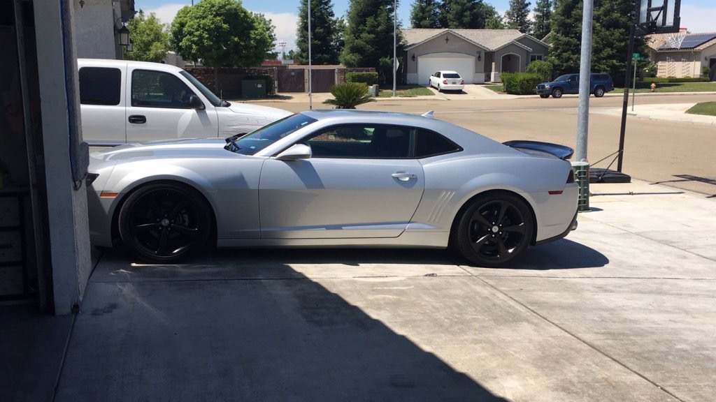 The tips stick out too far IMO, but otherwise looks good. I still wish that the rear end of the 14-15 cars were a bit more "polished" and were painted all the way. I've only seen a few that were, think one was a Green Flash SS (gorgeous car) and another was a V6 RS in Silver. The big black plastic piece being left unpainted seems so unfinished to me. Since you've got the spoiler on there to go with it, looks good. Silver and black, good theme for sure.