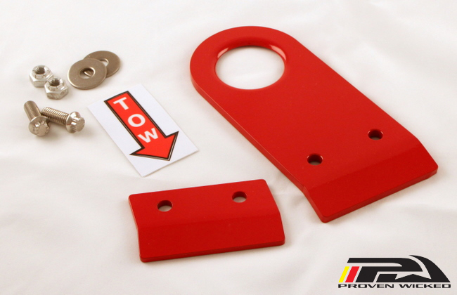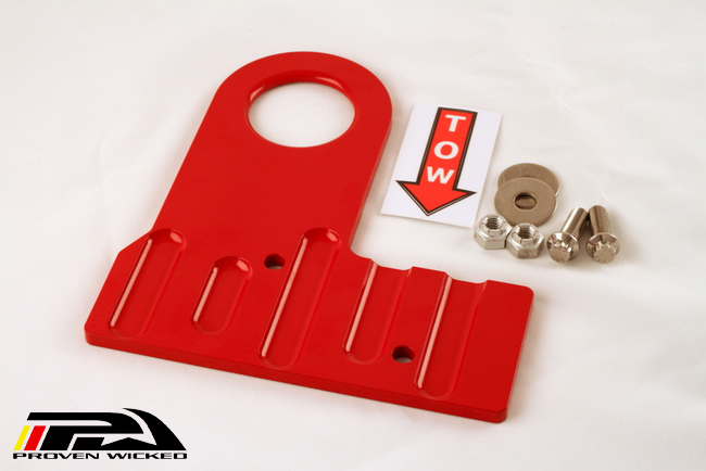 We make tow hooks for the front and rear of the Camaro. Our robust front and rear tow hook eyes are specifically CAD designed to have a perfect fit utilizing the crush bumpers. Comes complete with 12-pt ARP bolts and flexlock nuts, and "TOW" arrow decal. It is cut and tumbled from 4130 HT steel to easily meet the demands of all sanctions and backed by FEA stress analysis. The eye hole is radiused to prevent any stress risers when used. Clearance channels are machined to interlock with stiffening ribs on top of the factory bumper for added rigidity on the rear and a doubler plate for the front. Finished in a fitting red powdercoat.