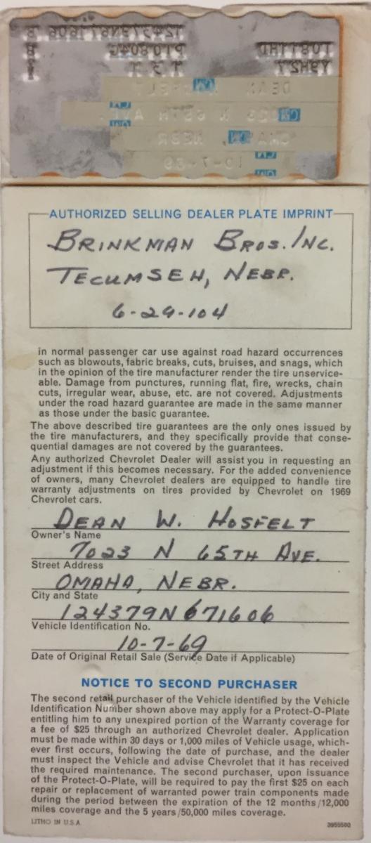 Finally got the paper work photographed of my second owner survivor. Changed rear end bearings, transmission shift linkage seal, radiator core, and converted to R134. My first car was a 1969. The stars aligned and I was lucky enough to find this car.