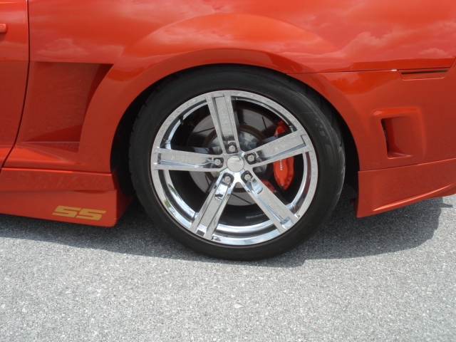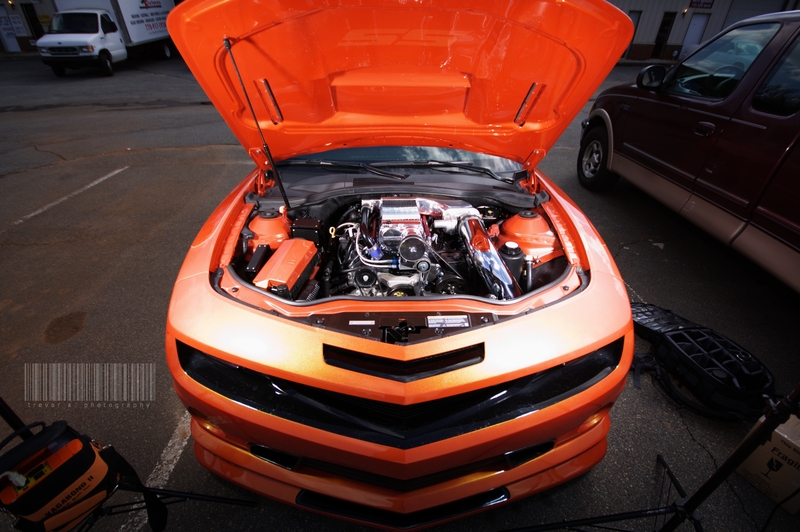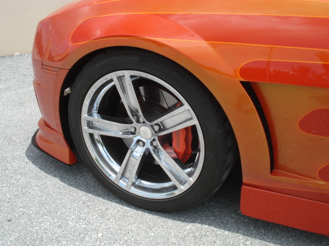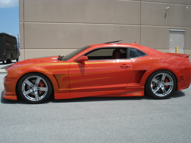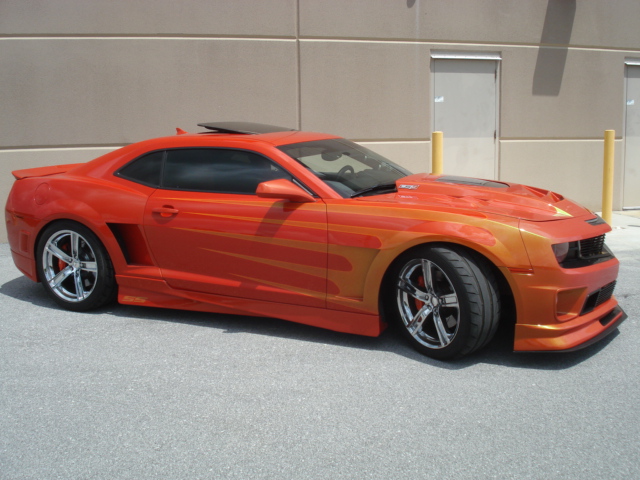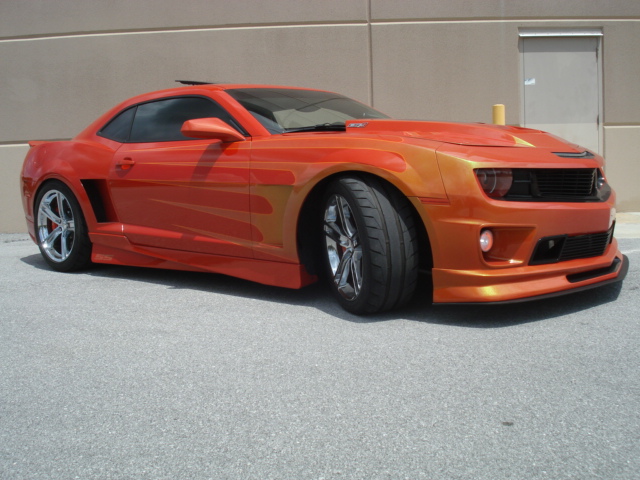This highly custom Camaro features the following modifications: Kenne Bell 2.8 s.c., unique custom fenders by Gary, Revolution SS front splitter and hood with custom vents, MPD1 rear spoiler, orange calipers, racing pedals, Rpi floor mats, MGW shifter, custom painted interior pieces, painted engine cover, fuse cover, fog light bezels, painted Roto Fab intake, LS7 style painted front & rear bumpers, shaved emblem on trunk, darkened tail lights, Solo Performance mach X cat back, BMR stabilizer bars, H&R springs, goodridge stainless brake lines,