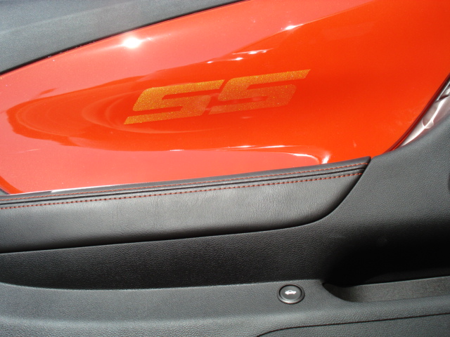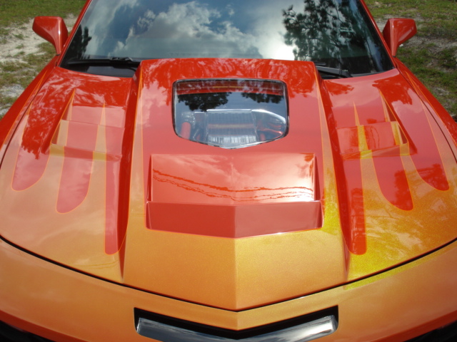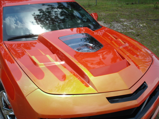 The paint job is a scallop design from the hood to the doors with a custom orange/gold pearl.