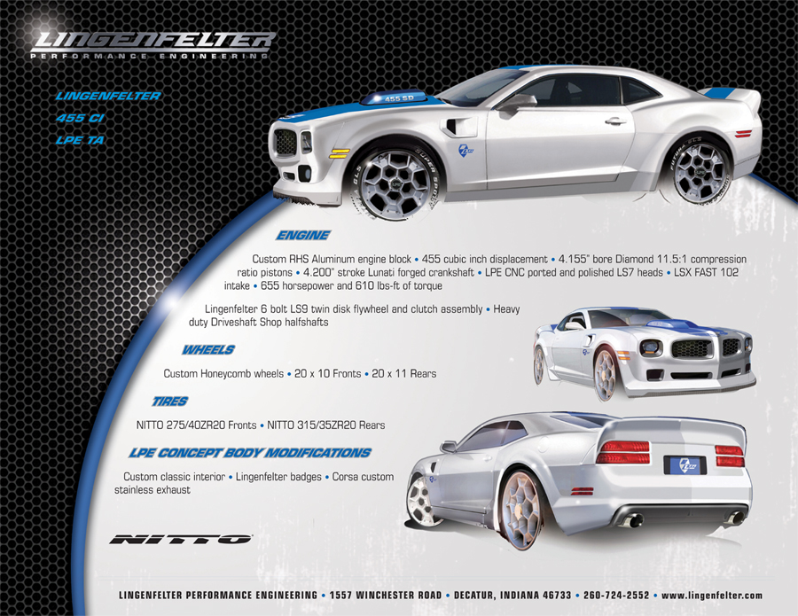 ![]() 2009 Corvette ZR1 LPE modified ZR1 Nitto booth #46115 ![]() 2010 Lingenfelter T/A LPE 455 CID engine 655 BHP / 610 TQ Nitto booth #46115 ![]() 2010 Chevrolet Camaro Lingenfelter 750 HP Supercharged LS7 engine Lingenfelter Enhancement Package Hotchkis booth #24442 ![]() 2010 Chevrolet Camaro Lingenfelter 570 HP Supercharged LS3 engine Lingenfelter Enhancement Package Corsa featured vehicle on display in exhibit hallway ![]() Corvette ZO6 GTR - Specter Werkes Specter Werkes GTR Package Lingenfelter 800 HP Twin Turbo Package HRE featured vehicle in exhibit hallway