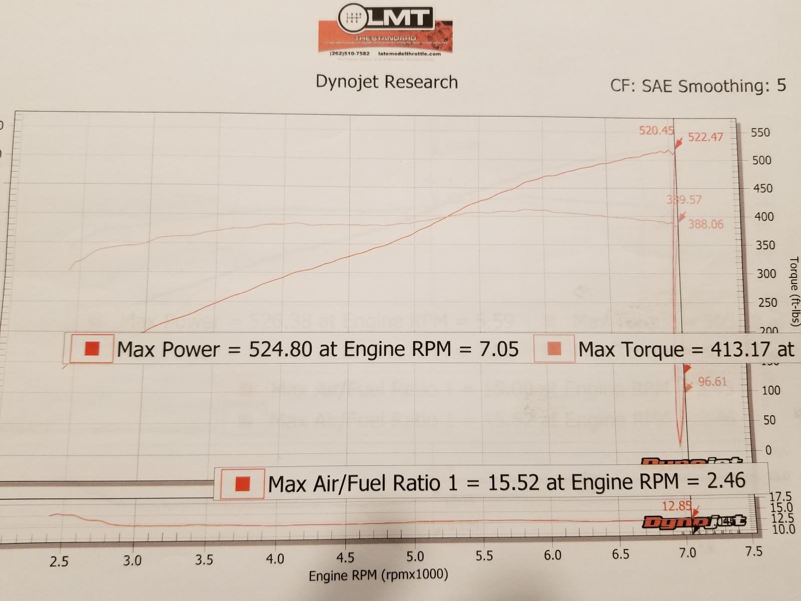 Nice numbers, but yes your torque is low with just CAI intake, SP headers, HFC and tune on my 13 I made 491 HP and 448 Torque on a old 235/239 cam but that was when it was .639/.623 and I had 112 lsa. I know the gears do matter in the read out but also its most likely a non load bearing dyno compared to the Mustang dyno I use. I would say its the gears making that low torque but it proves out the intake is good making more power. Wanting one in red someday for my beast maybe..if they don't make one for the ls7 ...? Small bore heads are on my wish list also. Unfortunately dynos and tuning are only as good as the tuner and what software and how experienced they are on what dyno on what conditions and etc...... Your torque should drop off more though at the end of the run for that cam heres my old dyno and maybe the intake helps or ....... ?