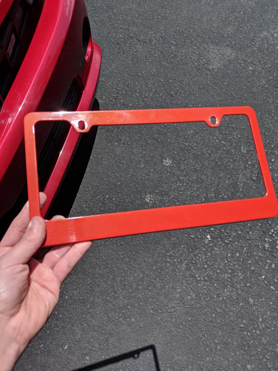 I bought this not too long ago from RPI Designs. It's a great quality, heavy, metal license plate frame painted inferno orange. Has a little mark near the holes from the screws that I used, wasn't noticeable on my car, shouldn't be on yours. It can be yours for $25 shipped!