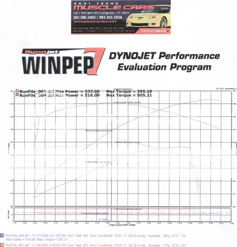 Also he is getting some Pedders XA's and we installed a set of PFADT sway bars. we will be making his vid in the next week or two, but till then here is a few pics and a dyno graph. the base line pull was 333.60HP 355.18TQ. after the ETMC 600HP kit it did 516.09HP and 505.21 THATS 625+ at the crank without a CAM or heads!!!!!!!!!!!!!! He also wanted a really safe tune so if you look close you will see the FLAT AFR line is at 11.6 where we normally would run HIGH 11's to 12 AFR and could get a few more out of her easy! Kit includes *ARH headers with High flow cats *TVS 2300 wtih 8 psi *new tr6 spark plugs *ETMC tune *ETMC ported TB *Roto Fab CAI *Magnaflow Axleback Exhaust THE CAR ![]() ![]() ![]() ![]() THE GOODIES ![]() ![]() ![]() ![]() ![]() ![]() ![]() ![]() ![]() ![]()