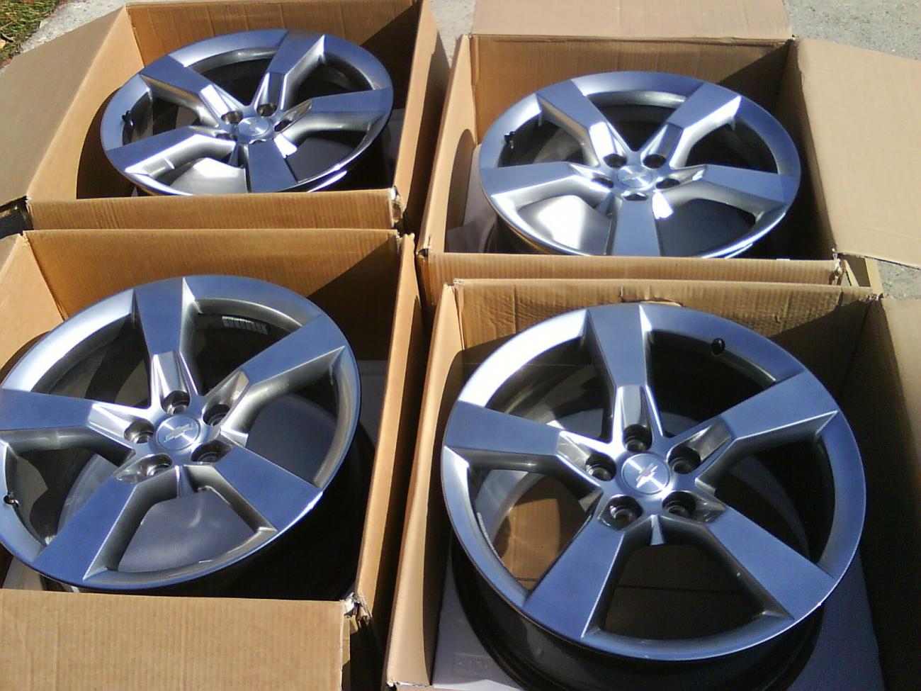 no TPMS, pulled at dealers. One or two have very minor handling or tire removal scratch. Can provide pictures. 20" polished ($500.00 upgrade) with TPMS and brand new rear tires with no miles and 90% tread on fronts about 2,000 miles. Front left and right rear minor curb damage. Easy to repair and reclear coat. $1,000.00 plus shipping for set. Great for V6 Camaro. Will sell separate both rears $700.00 both fronts $500.00 plus shipping. Pic on car. Can provide more detailed pics. Last edited by nuptualnemesis; 12-13-2009 at 05:13 PM. |