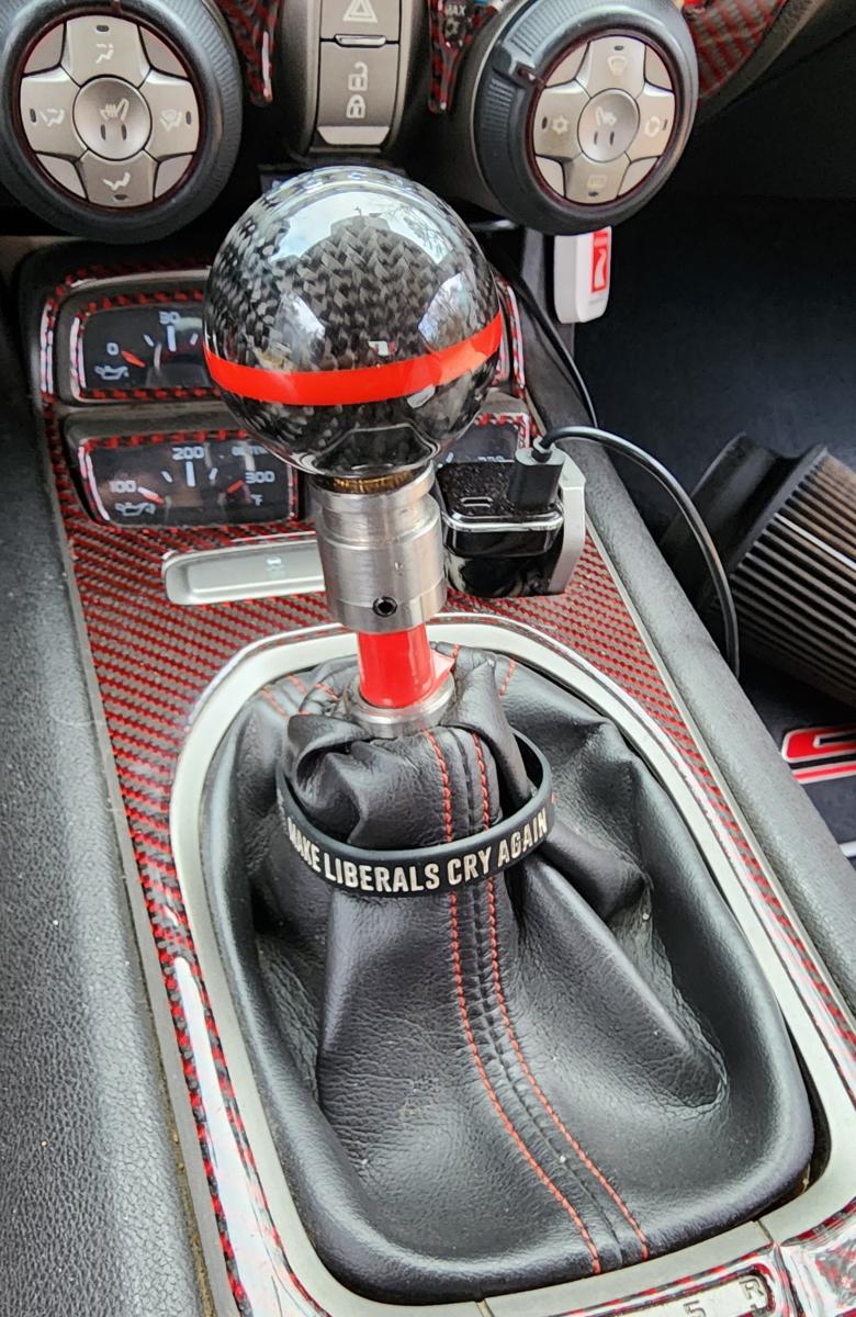 Billetworkz knob and Redline boot. Not a fan of this size knob, but the colors add some spark to the interior.