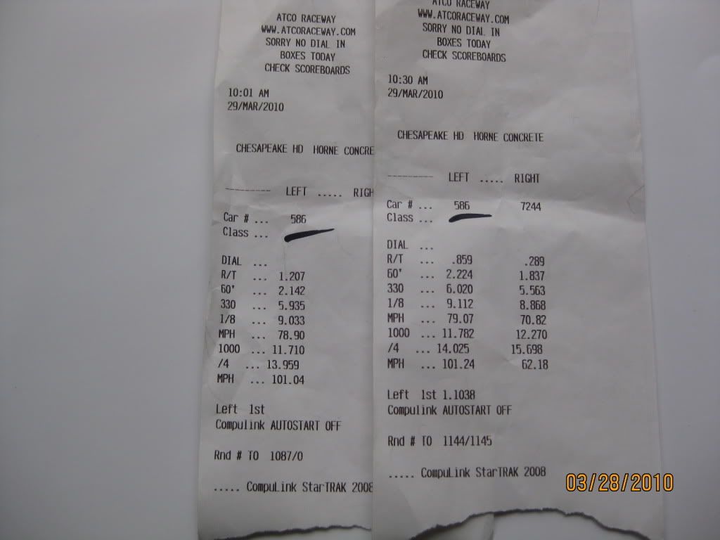 Ok... looking at that time slip... 101 MPH trap... that's amazing!!! There is definitely room for improvement in your ET! I'm thinking the torque management is killing the shifts....