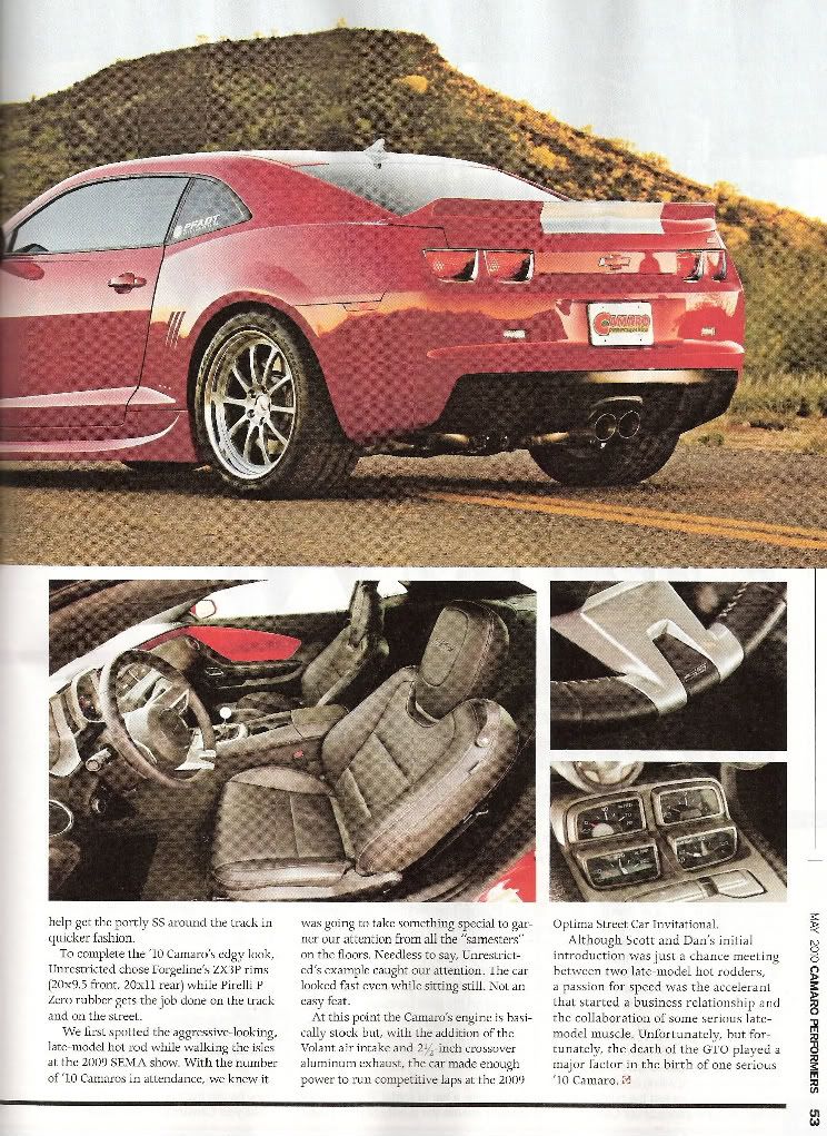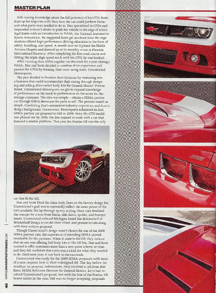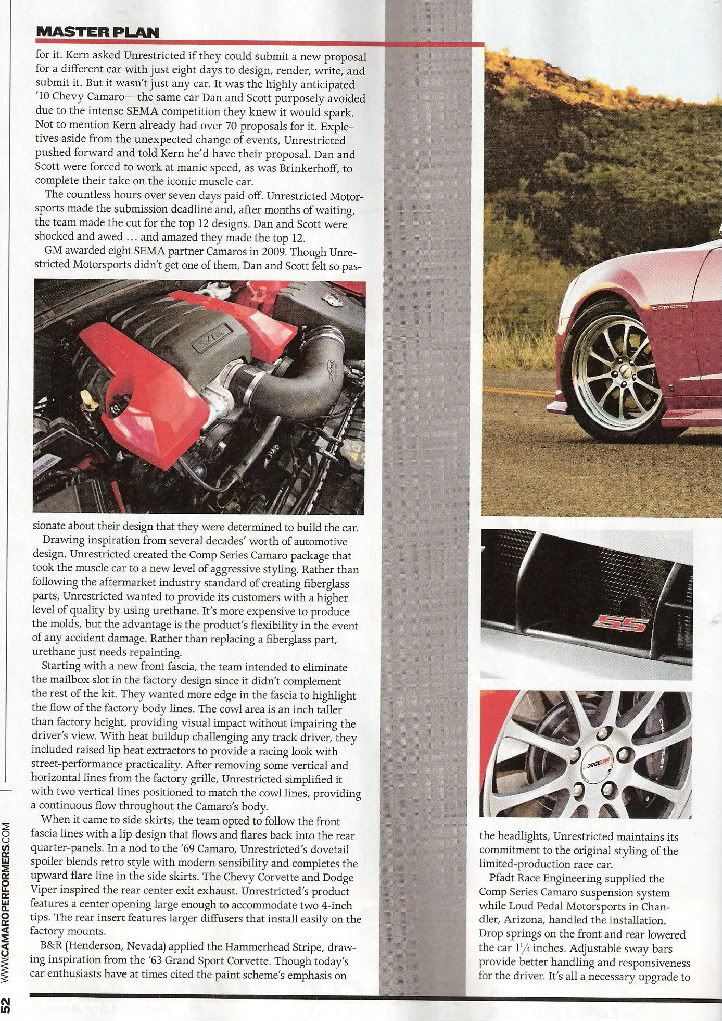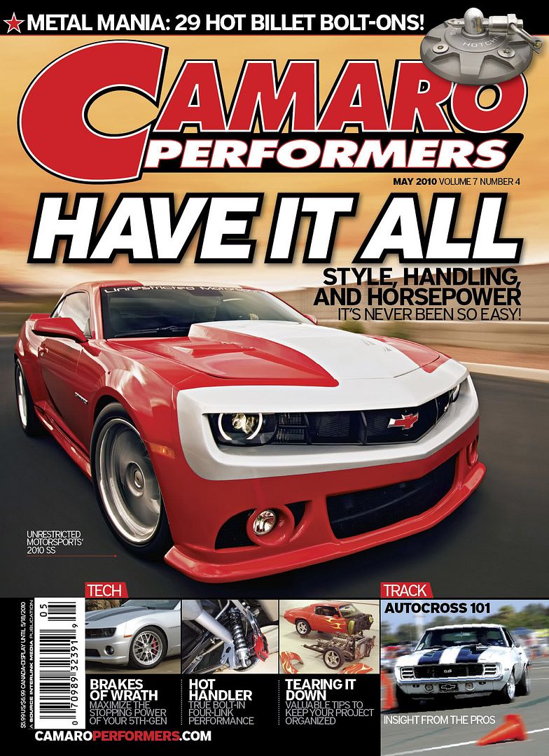 Unrestricted Motorsports' Comp Series Camaro will be featured in a story in the latest issue of Camaro Performers magazine, to hit newsstands yesterday. The Comp Series Camaro debuted at the 2009 SEMA show in Las Vegas and was also showcased at the Chicago Auto Show in February. For more information: www.unrestrictedmotorsports.com or www.camaroperformers.com.