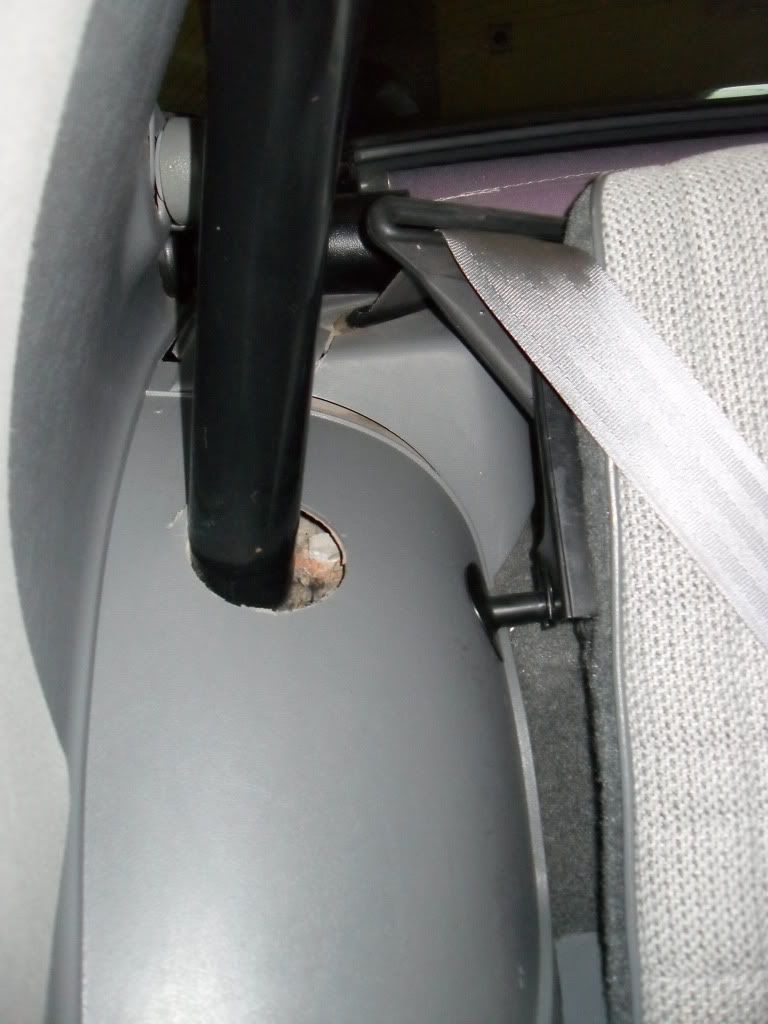 Id say it should shorten up the top a bit so not right over head, [cause id hit mine on it] but then run two legs straight down the sides to the normal attachment point in the floor but no cross bar so the backseat is still access-able.