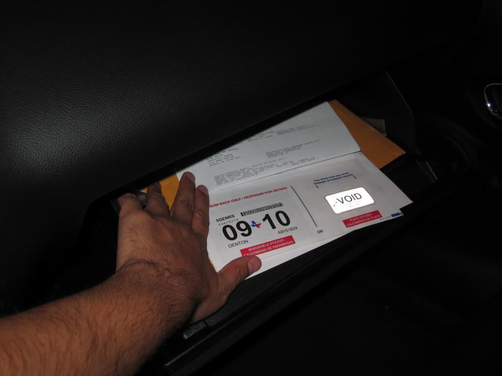 ![]() Okay so this is where I keep mine ... seriously ... the window is too small for anymore stickers. So if I ever get pulled over ... there it is all nice a neat. You get a ticket for not having one, not for not having it on the window. By the way .. it's where I keep my front plate too. Heck, if the car didn't already have the inspection sticker, I would have that too in the glove box. Speaking of the glove box or glove compartment ... does anybody ever put gloves in there, they should rename it, the catch all box.